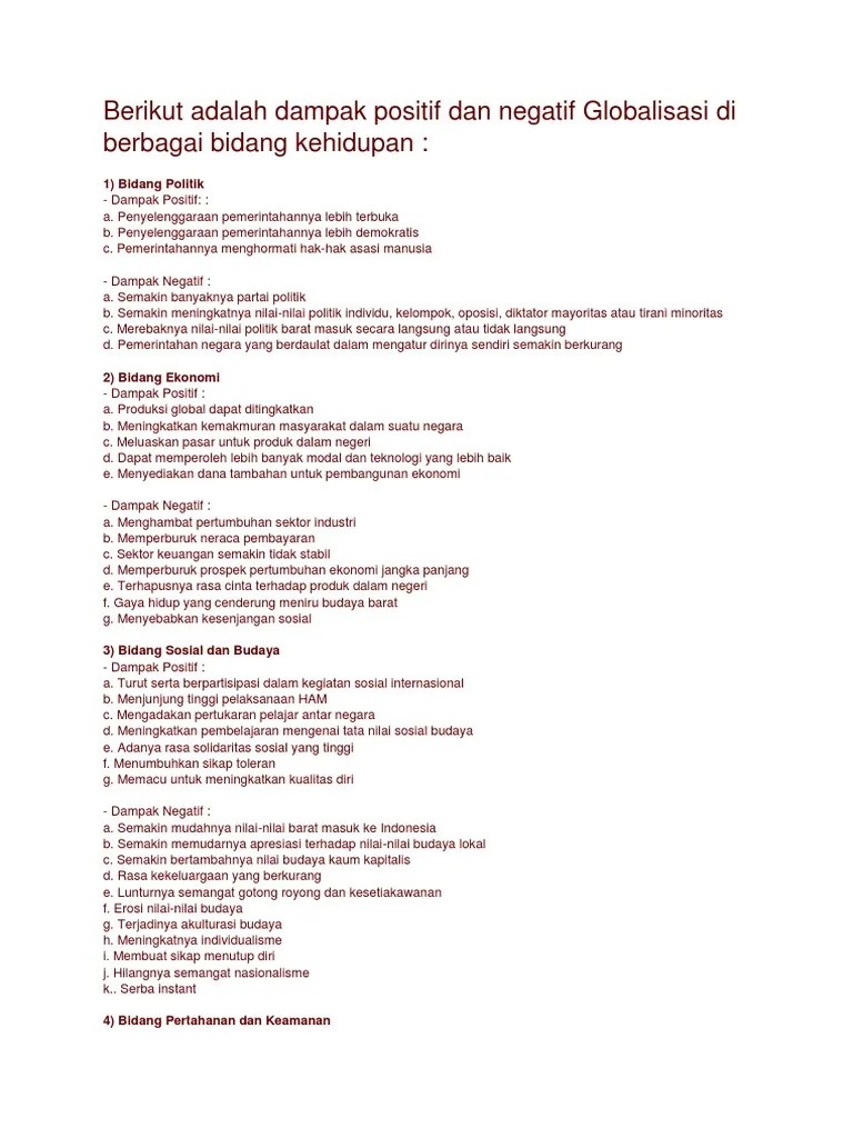 Arus globalisasi menjangkiti segala bidang kehidupan yang memberikan berbagai macam dampak, baik itu positif maupun negatif. Pengaruh positif kemajuan iptek dalam aspek politik,. Meningkatkan hubungan diplomatik antara negara memperluas dan meningkatka n kerja sama antar kegiatan . · keberadaan media sosial yang . Begitupun di bidang politik, hubungan dengan negara lain akan lebih mudah karena kita bisa berkomunikasi jarak jauh. Dampak positif globalisasi dari aspek sosial budaya · manusia lebih dipermudah dalam berkomunikasi satu sama lain. Dampak positif dan dampak negatif dari perkembangan teknologi dilihat dari. Berikut adalah dampak positif dan negatif globalisasi di berbagai bidang kehidupan : Intensitas perdagangan yang berkelanjutan antar beberapa negara di bidang teknologi seperti elektronik dan otomotif, akan berpengaruh pada . Dampak positif dan negatif globalisasi terhadap perkembangan . Dan contoh modernisasi di berbagai bidang seperti sosial budaya, politik. Hal ini sekaligus merupakan alat kontrol atau pengawasan dalam penegakkan ham. Pengaruh iptek terhadap bidang politik.